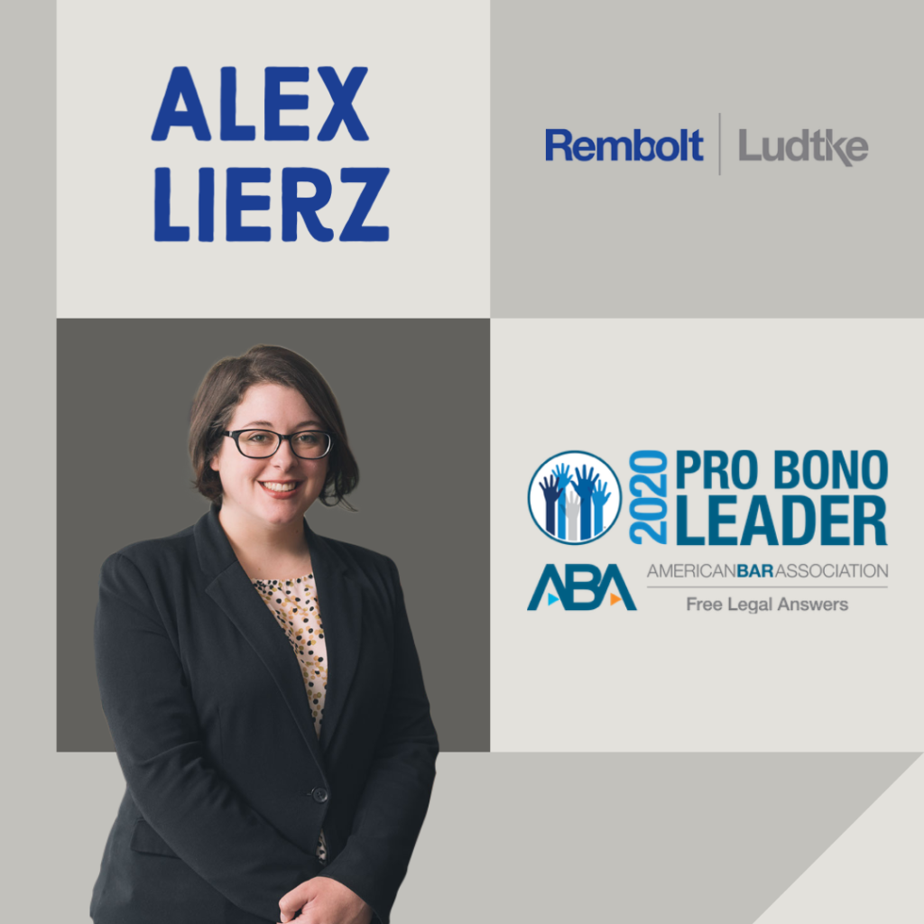 Rembolt Ludtke attorney Alex Lierz has been recognized as a 2020 Pro Bono Leader for her contributions to the Free Legal Answers project of the American Bar Association . This annual recognition is presented to individual attorneys, law firms, corporate law departments and other organizations that have provided extraordinary pro bono services through ABA Free Legal Answers.