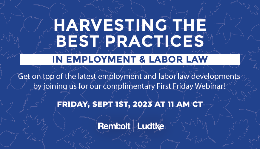 Autumn is almost here, which means leaf raking and the fall harvest are right around the corner. It’s also the season for you to get on top of the latest employment and labor law developments as you prepare for a new year. What’s changed regarding the laws impacting employee handbooks? Are noncompete agreements still enforceable? What’s the latest regarding the proposed changes to the federal overtime salary requirements and the Nebraska ballot measure on mandatory paid leave? What do you need to know about the new Pregnant Workers Fairness Act (PWFA)? What things can we be doing during these last months in 2023 to get our HR silos ready for 2024? Get answers to these emerging issues and more by joining us for the next edition in our complimentary First Friday Webinar series at 11 a.m. CT, Friday, September 1, 2023.