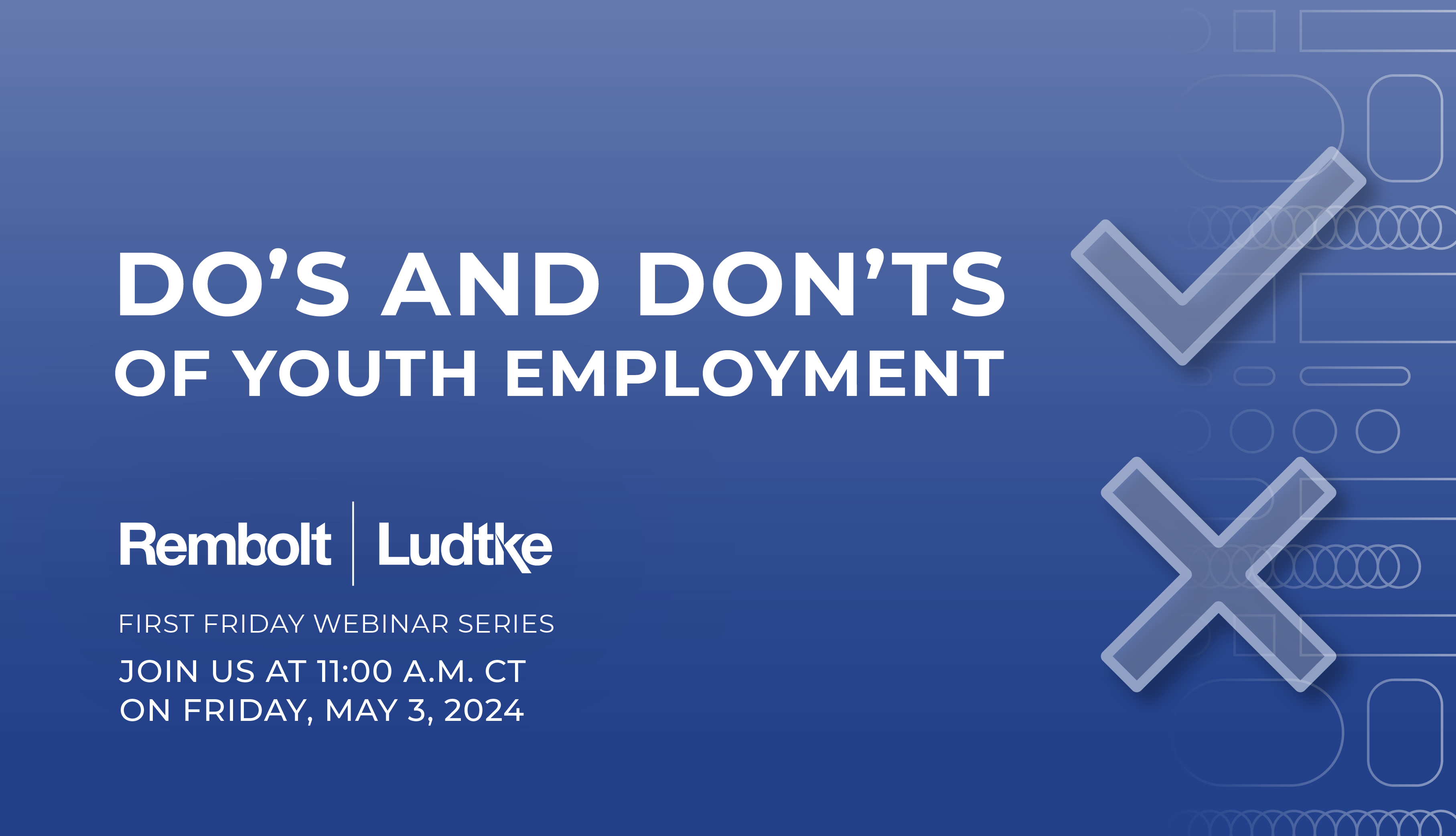 Summer is almost here! Make sure your employment practices don’t slow you down as temperatures rise, and more youth enter the workforce with the end of the school year. In this installment of our First Friday Webinar series we will address the do’s and don’ts of youth employment. We’ll also cover remote work and telecommuting issues that may increase during the summer months as well as the recently-released Pregnant Workers Fairness Act (PWFA), DOL Overtime and FTC Noncompete final rules. Join us at 11:00 a.m. CT, Friday, May 3, 2024!