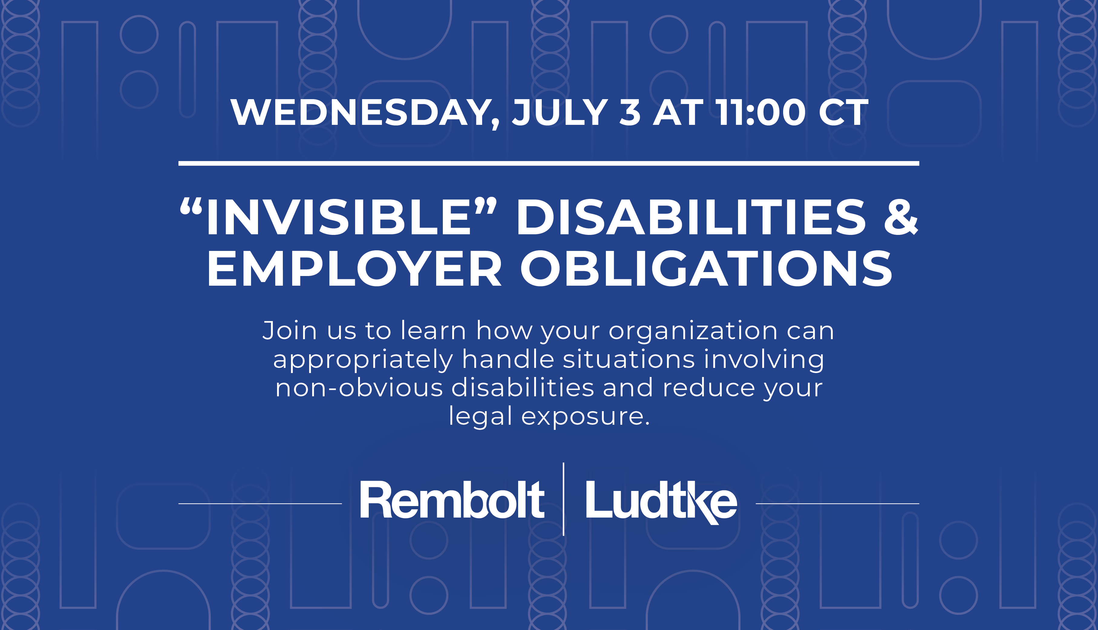 Adopted in 1990, the Americans with Disabilities Act (ADA) protects qualified individuals with a disability from workplace discrimination. Instances where an employee has a non-apparent disability, such as diabetes, epilepsy, mental illness, or depression, raise unique issues for both the employer and the employee. In this installment in our First Friday Webinar series, the Rembolt Ludtke employment and labor law attorneys will review the relevant legal issues, EEOC guidance and court decisions that come into play when “invisible” disabilities are at issue, including pre-employment inquiries and medical examinations, workplace disclosure, reasonable accommodations and confidentiality. With the July 4th holiday weekend, we’re moving this month’s installment to Wednesday, July 3 at 11:00 CT. Join us to learn how your organization can appropriately handle situations involving non-obvious disabilities and reduce your legal exposure.