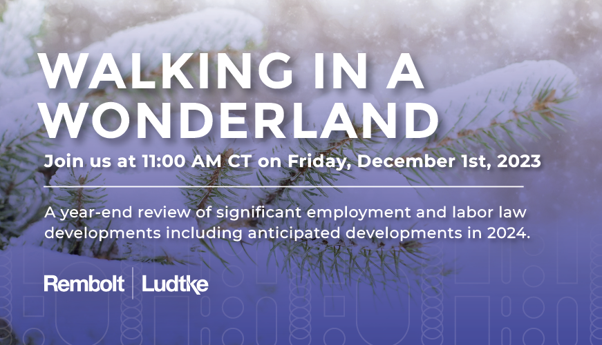 For this installment in our First Friday Webinar series the Employment & Labor attorneys at Rembolt Ludtke will provide a year-end review of significant employment and labor law developments and highlight anticipated developments in 2024. Among other things the webinar will address the EEOC’s recently released Strategic Enforcement Plan that identifies the agency’s priorities for the coming years and significant changes from the NLRB and other agencies that may impact your organization. Join us at 11:00 a.m. CT on Friday, December 1, 2023.
