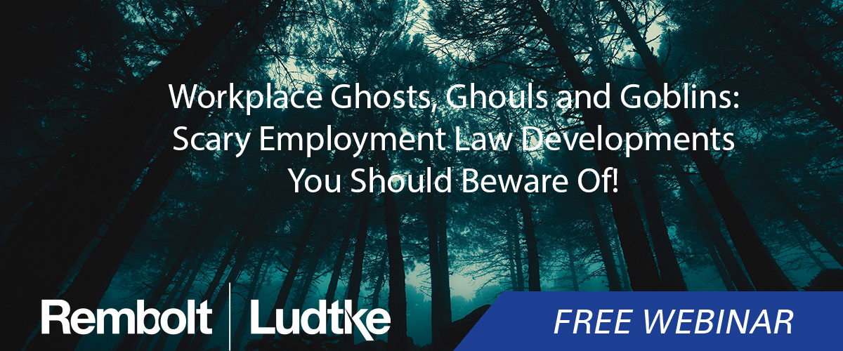 Join Rembolt Ludtke’s employment and labor law attorneys on Friday, October 2, 2020, at 11 a.m. CT to learn about the legal developments that are haunting the workplace, and how to avoid them.